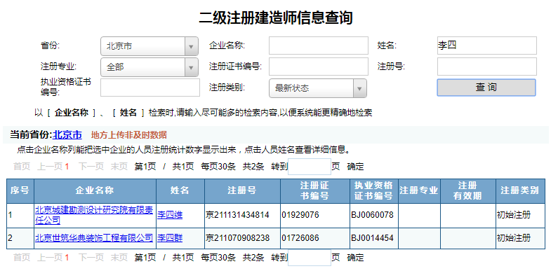 选择北京市,然后输入名字或者企业名称,就能搜索出你的证书目前状态如何?【以李四为例子】