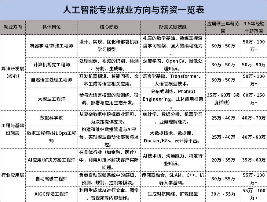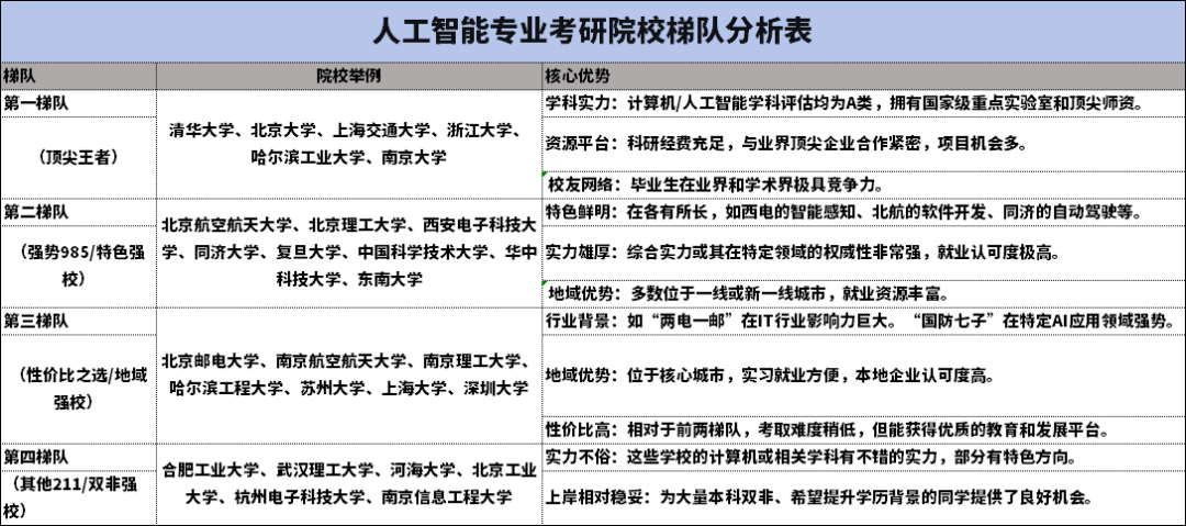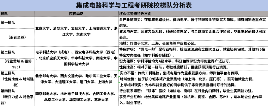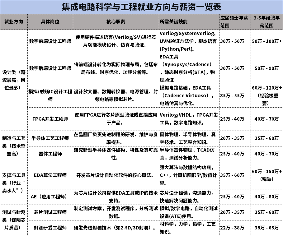 展望未来10年,工科的发展将与全球重大挑战和科技革命紧密相连。基于当前的技术趋势和战略需求,这几个专业是国家战略急需的“绿牌专业”:就业稳,薪资高,前景清晰。现阶段人工智能与机器学习领域的“蛋糕”正在变得更大,但分蛋糕的规则变了。它不再是一个容易“速成”和“淘金”的领域,而是回归到工科的本质:需要扎实的基础、强大的工程实践能力和持续学习的热情。下面是我总结的人工智能专业就业方向及薪资一览表随着人工智能的发展热潮,不少同学在考研择校问题上犯了难,下面可以看看人工智能专业考研梯队分析归类。集成电路考研是当前工科中 “前景极其光明”与“挑战极其巨大”并存的典型代表。它是一条为国家解决“卡脖子”难题的“黄金赛道”,但也是一条需要顶尖智慧和艰苦付出的赛道。总结:“设计岗”是薪资高地:尤其是模拟IC设计和数字前后端,技术深度要求高,经验越丰富越值钱。“制造/工艺岗”是基石:虽然起薪和涨幅可能不如设计,但技术非常稳定,是国家和行业长期投入的重点,不可或缺。在读期间,参与流片项目、使用业界主流EDA工具、参加集成电路创业大赛,是获得高薪Offer的硬通货。