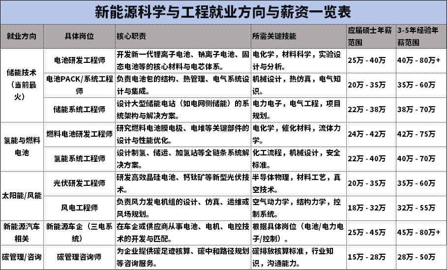 新能源考研是当前工科中 “顺应国家战略、前景广阔”且“竞争日趋激烈” 的典型代表。它是一条投身于“双碳”目标的绿色赛道,但也是一条需要扎实基础和明确方向选择的赛道。下面整理了新能源科学与工程就业方向与薪资一览表。总结:1.储能是绝对热点:尤其是电池研发和储能系统方向,市场需求爆发,薪资增长快。2.氢能是未来风口:目前处于示范推广期,未来潜力巨大,适合有长远眼光的同学提前布局。3.太阳能/风能技术成熟:行业集中度高,更偏向大型国企和巨头,薪资相对稳定。