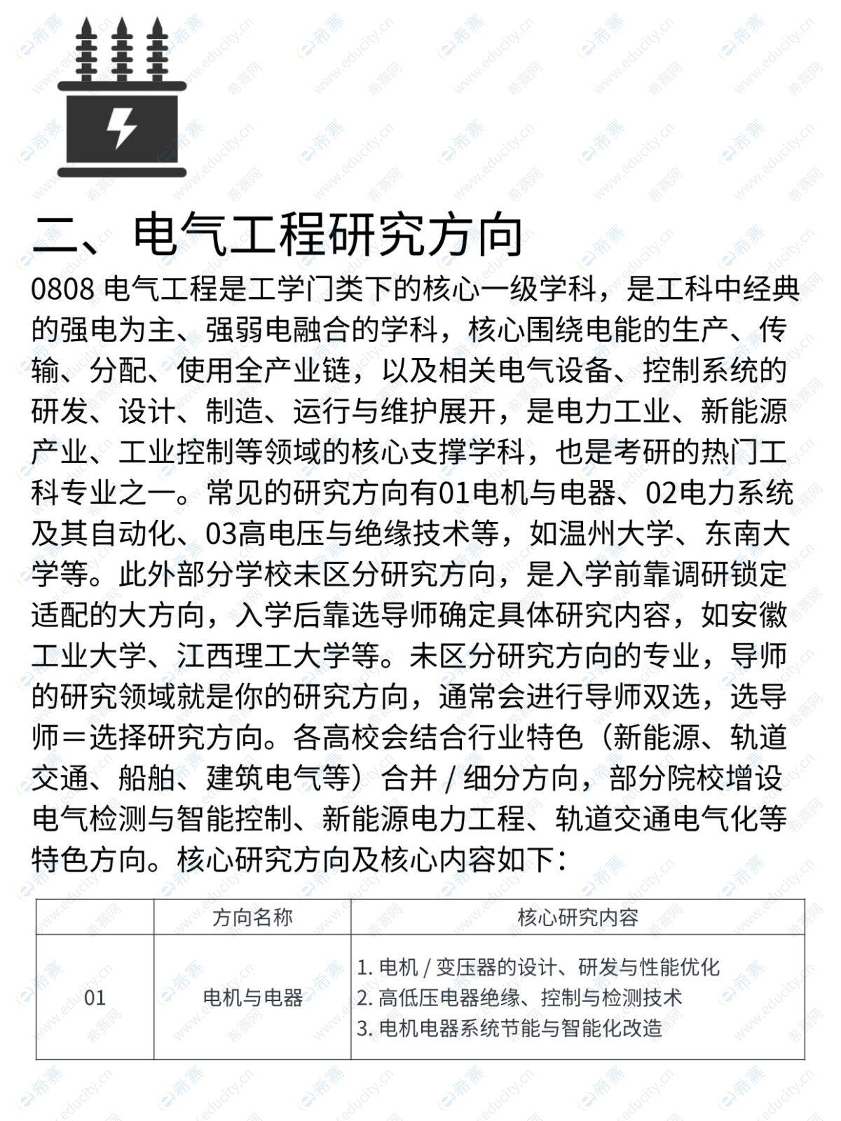 涵盖电机与电器、电力系统及其自动化、高电压与绝缘技术等基础方向,部分院校增设新能源电力工程、轨道交通电气化等特色方向;未区分方向的专业可通过选择导师确定具体研究内容。