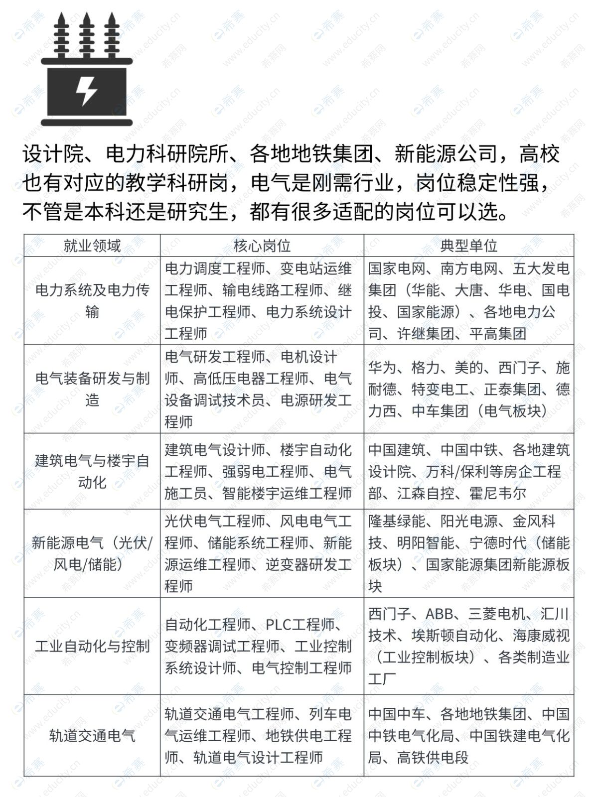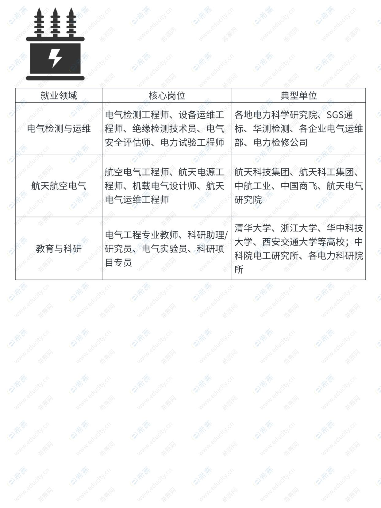 就业面广、实用性强,覆盖电力系统、电气装备制造、新能源(光伏 / 风电)、工业自动化等领域,核心岗位为各类电气工程师,典型单位包括国家电网、南方电网、华为、格力等,岗位稳定性强,是刚需行业。