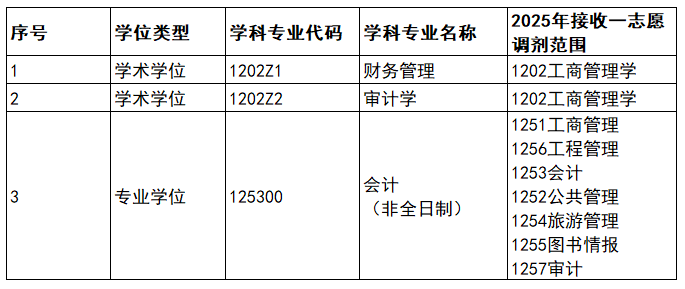 会计(非全日制)接收调剂专业要求:根据《2025年全国硕士研究生招生工作管理规定》:报考工商管理、公共管理、会计、旅游管理、图书情报、工程管理、审计等7个专业学位的考生,在满足调入专业报考条件、且初试成绩同时符合调出专业和调入专业在调入地区的全国初试成绩基本要求的基础上,可申请相互调剂,但不得调入其他专业;报考其他专业的考生不得调入该7个专业学位。