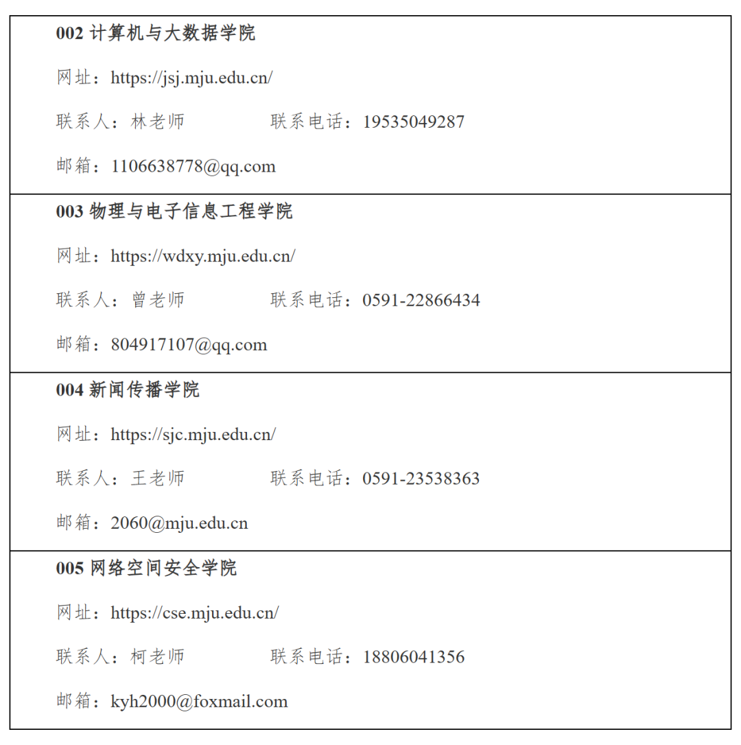 闽江学院2026年接收优秀应届本科毕业生推荐免试攻读硕士学位研究生各招生学院联系方式
