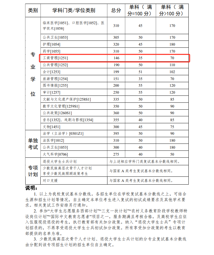 工商管理【1251】复试分数线为:146/70/35。根据学校有关2026年硕士研究生招生考试复试工作要求,具体复试方案及相关安排将于近期公布,请同学们及时关注通知。