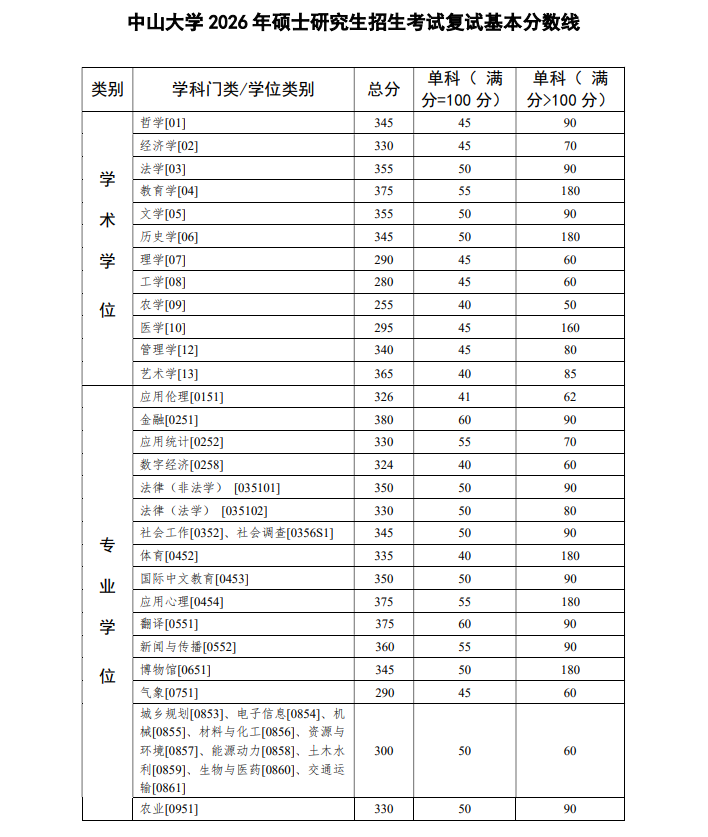 同学们好,《中山大学2026年硕士研究生招生考试复试基本分数线》已发布: