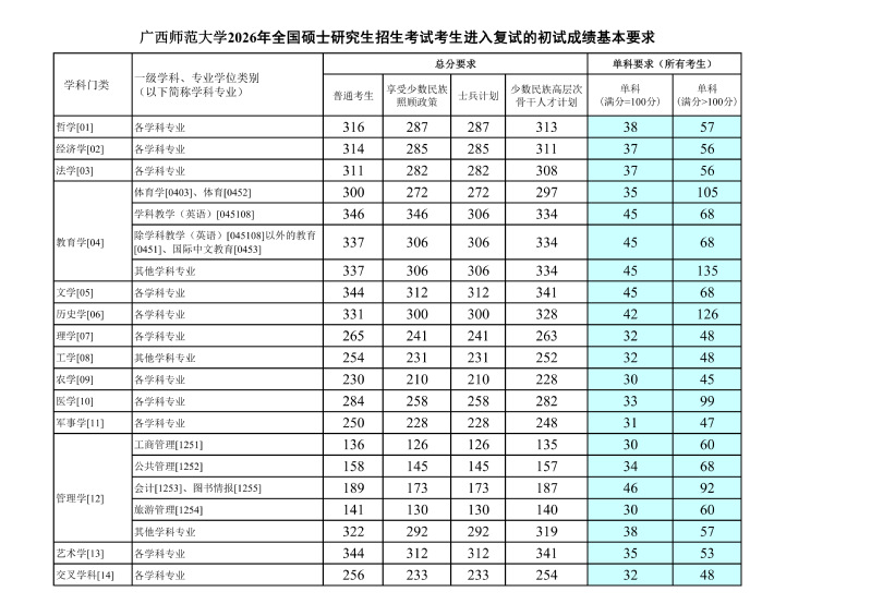 根据教育部有关文件精神,结合我校实际情况,经广西师范大学研究生招生委员会研究决定,我校2026年硕士研究生招生考试一志愿考生进入复试的初试成绩基本要求如下: