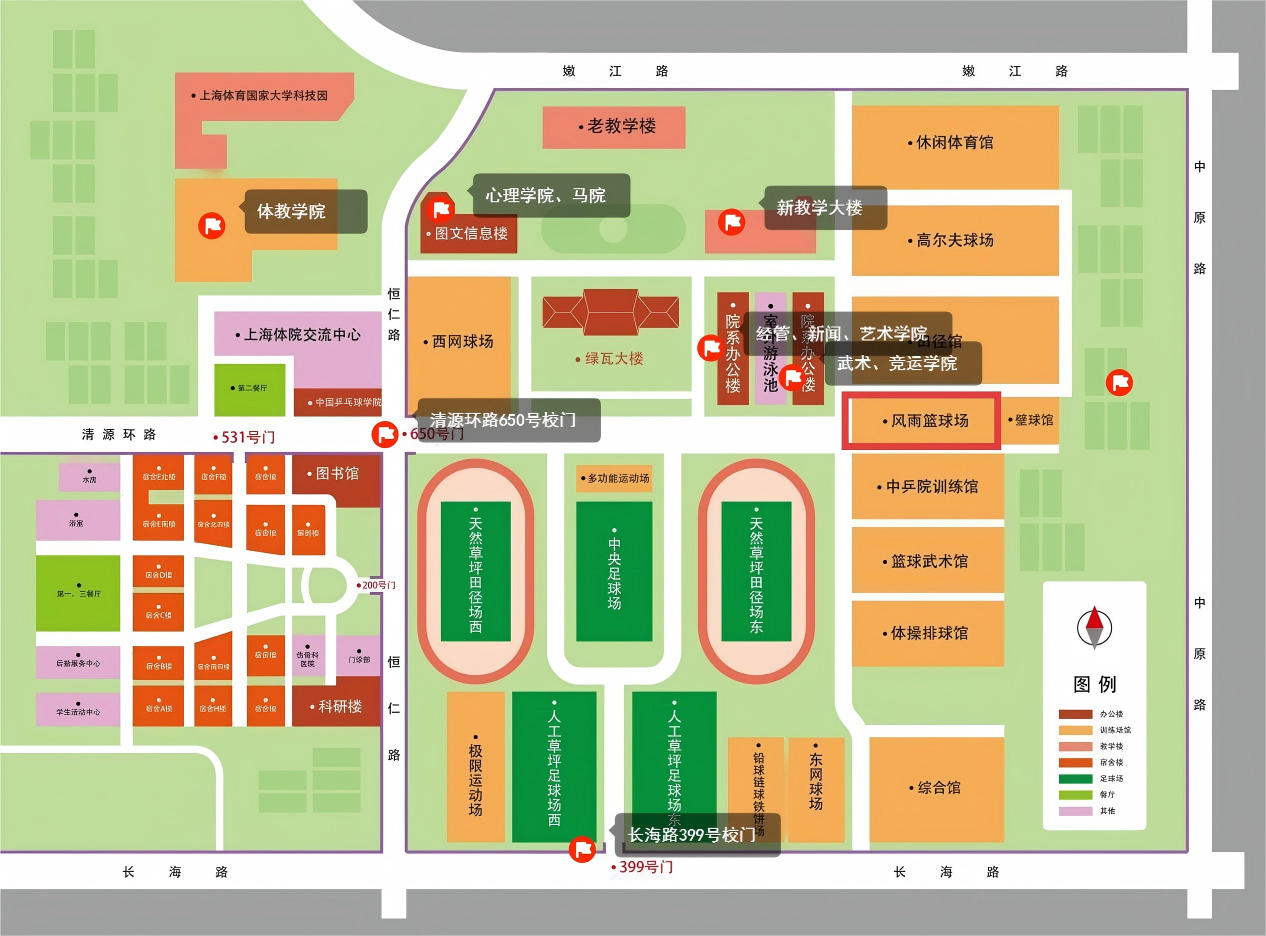 入校校门:上海体育大学,上海市杨浦区清源环路650号或者长海路399号。