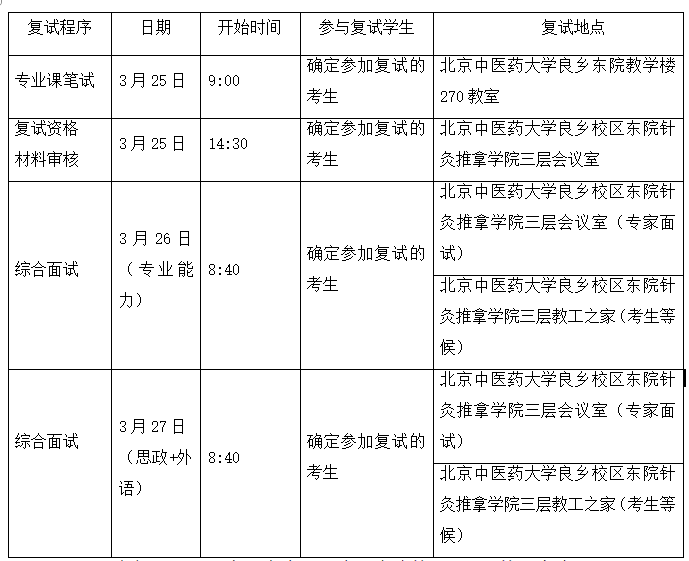 所有复试环节均在北京中医药大学良乡校区完成,校外考生需于入校前24小时在北京中医药大学官方微信进行自助预约入校,并携带身份证在复试当天于学校东院西门刷身份证入校。