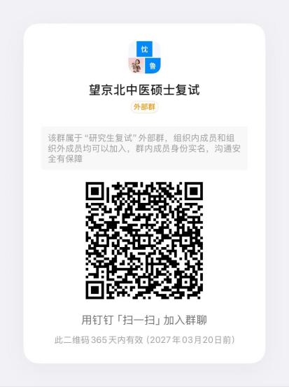 复试考生于3月25日17:00之前扫码实名申请加入我院考生钉钉群:“望京北中医硕士复试群”(钉钉群号:161290018765)后续将进行入群审核,请考生及时入群并务必关注钉钉群内消息。