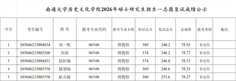南通大学历史文化学院2026年硕士研究生招生一志愿复试成绩公示