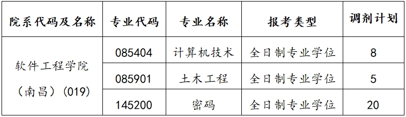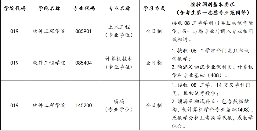 根据2026年硕士研究生招生考试初试国家分数线及我院一志愿考生上线情况,我院土木工程(全日制专业学位,专业代码:085901)、计算机技术(全日制专业学位,专业代码:085404)、密码(全日制专业学位,专业代码:145200)接受部分调剂考生,实际调剂学科专业以调剂平台公布的为准。