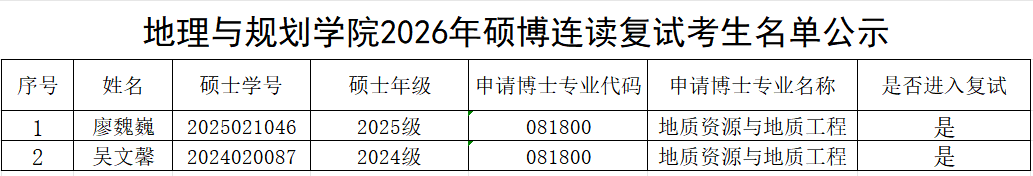 现将地理与规划学院2026年进入硕博连读复试的考生名单进行公示,公示期:4月9日—4月13日。