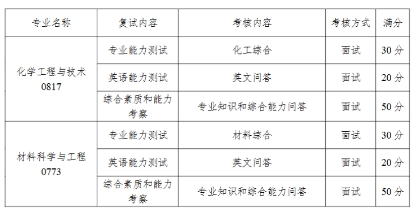 材料科学与工程、化学工程与技术专业复试成绩=专业能力测试成绩+英语能力测试成绩+综合素质和能力考察成绩,满分100分。复试成绩60分及以上为合格,复试成绩不合格者,不予录取。