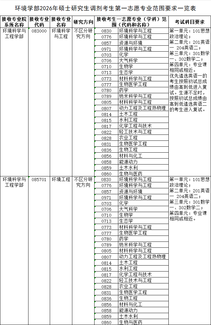3.调剂考生第一志愿报考专业范围、科目要求等见“环境学部2026年硕士研究生调剂考生第一志愿专业范围等学术要求一览表”(附件2)。(采用调剂遴选优先原则的专业方向,优先仅为优先遴选进入复试,并不是优先录取,录取按照总成绩计算办法统一排队择优录取。)