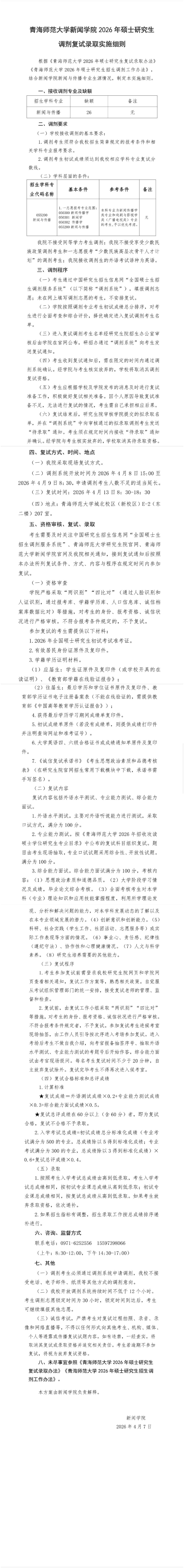 青海师范大学新闻学院2026年硕士研究生调剂复试录取实施细则