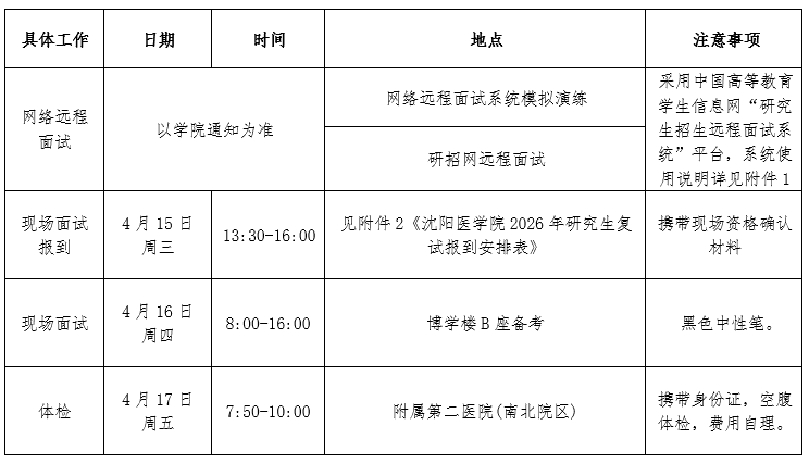 学校调剂工作将通过“全国硕士研究生招生调剂服务系统(http://yz.chsi.com.cn)”统一进行,所有考生的调剂流程均通过此系统完成。调剂条件、具体要求参考《沈阳医学院2026年硕士研究生调剂公告(第一轮)》(https://yjsjy.symc.edu.cn/info/3832/14172.htm),复试日程安排见下表。