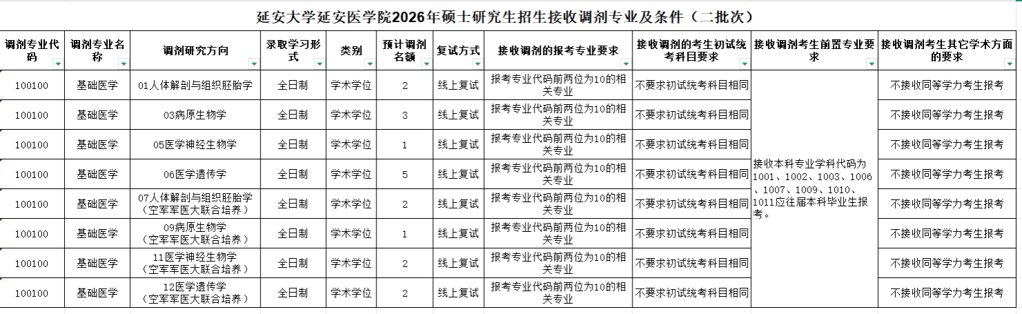 根据《延安大学2026年硕士研究生复试录取工作实施方案》与《延安大学2026年硕士研究生招生接收调剂办法公告》规定,结合2026年报考我校硕士研究生考生成绩上线情况,我院部分招生学科(专业)将接收调剂考生,现将有关调剂事项公告如下: