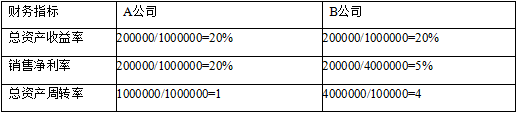 A、B公司资产规模和收益相等导致总资产收益率相同。但对总资产收益率指标作进步分解,结果是:A公司有较高的销售净利率与较低的资产周转率,B公司有较低的销售净利率与较高的资产周转率。其原因主要是:A公司可能是一家固定资产比较高的重工业企业,总资产周转率相对较低,销量小但产品售价相对较高因此,一般而言这种企业主要通过提高销售利润率来提高总资产收益率;B公司可能是一家固定资产比重较低的零售业,销量大但销售利润率相对较低,因此,一般而言这种企业主要通过加强总资产周转率来提高总资产收益率。