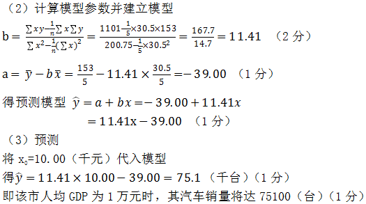 某城市汽车销售与该市人均GDP关系统计资料如题38表所示,试建立一元回归预测模型,并预测该市人均GDP为10000元时的汽车销量。
