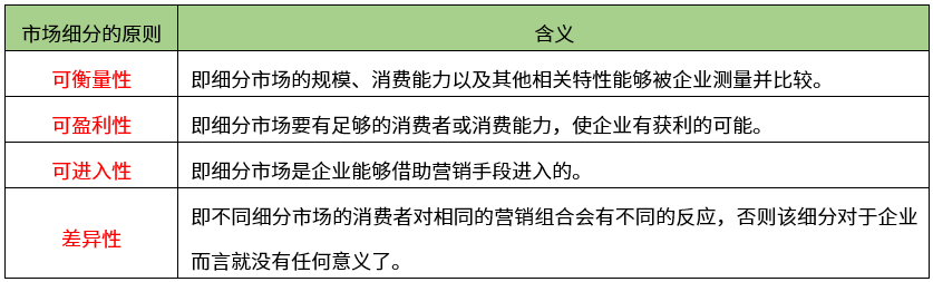 【解析】市场细分的原则:(1)可衡量性;(2)可盈利性(效益性);(3)可进入性;(4)差异性。其中,可盈利性(效益性)是细分市场要有足够的消费者或消费能力,使企业有获利的可能。故本题选D。