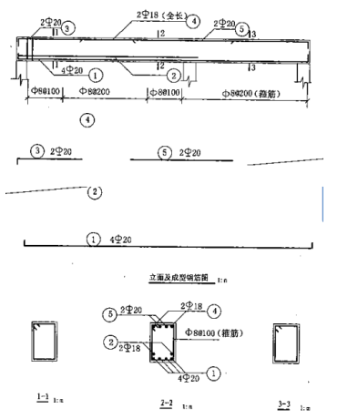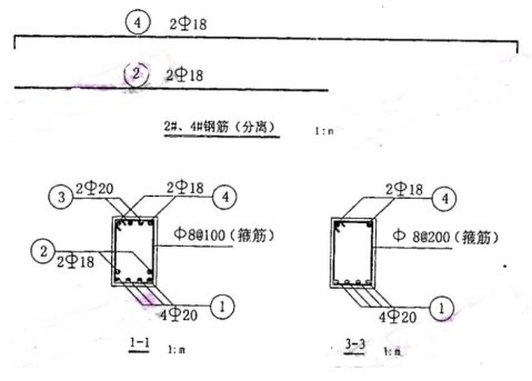 补全梁的断面l—l,3—3:画全成型钢筋图(2#、4#钢筋。尺寸不注) (本大题共10分)