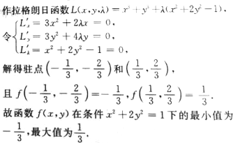 求函数f(x,y)=x 3+y 3在条件x 2+2y 2=1下的最值。