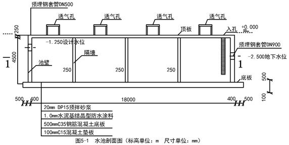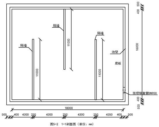 A公司承建某地下水池工程,为现浇钢筋混凝土结构。混凝土设计强度为C35,抗渗等级为P8。水池结构内设有三道钢筋混凝土隔墙,顶板上设置有通气孔及入孔,水池结构如图5-1,5-2所示。