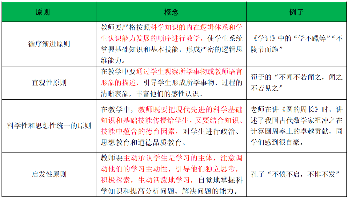本题考查教学原则。教学原则是根据一定的教学目的和对教学过程规律的认识而制定的指导教学工作的基本准则和要求。中学常用的教学原则包括直观性原则、启发性原则、巩固性原则、循序渐进原则、因材施教原则、理论联系实际原则、科学性和思想性相统一原则、量力性原则。