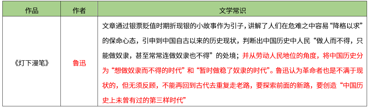 【考点】本题考查指定篇目-议论文单元-《灯下漫笔》