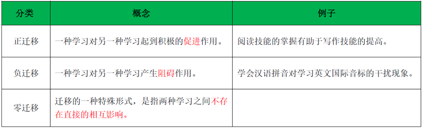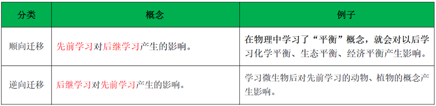 本题考查迁移的分类。把根据迁移的性质不同,可以把迁移分为正迁移、负迁移、零迁移。根据迁移发生的方向不同,可以把迁移分为顺向迁移和逆向迁移。题干中, 先学会的打羽毛球对后学习的打网球的影响是顺向迁移,很快学会代表这种影响是积极的,属于正迁移。因此,题干选A。