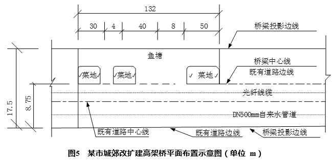 某公司中标承建该市城郊结合交通改扩建高架工程,该高架上部结构为现浇预应力钢筋混凝土连续箱梁,桥梁底板距地面高15m,宽17.5m,主线长720m,桥梁中心轴线位于既有道路边线。在既有道路中心线附近有埋深1.5m的现状DN500自来水管道和光纤线缆,平面布置如图4所示。高架桥跨越132m鱼塘和菜地。设计跨径组合为41.5+49+41.5m。其余为标准。跨径组合为(28+28+28)m×7联。支架法施工。下部结构为H型墩身下接10.5m×6.5m×3.3m承台(埋深在光纤揽下0.5m),承台下设有直径1.2m,深18m的人工挖孔灌注桩。