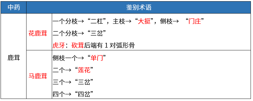 本题考鹿茸的鉴别术语。马鹿茸:侧枝一个者习称“单门”,二个者习称“莲花”,三个者习称“三岔”,四个者习称“四岔”。故本题选A。鹿茸的鉴别术语总结如下: