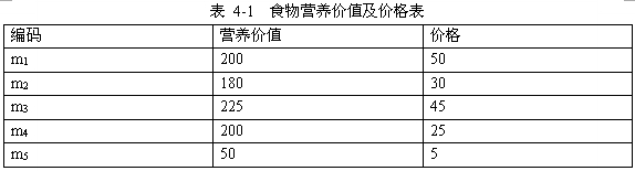 现有5项食物,每项食物的营养价值和价格如表4-1所示。