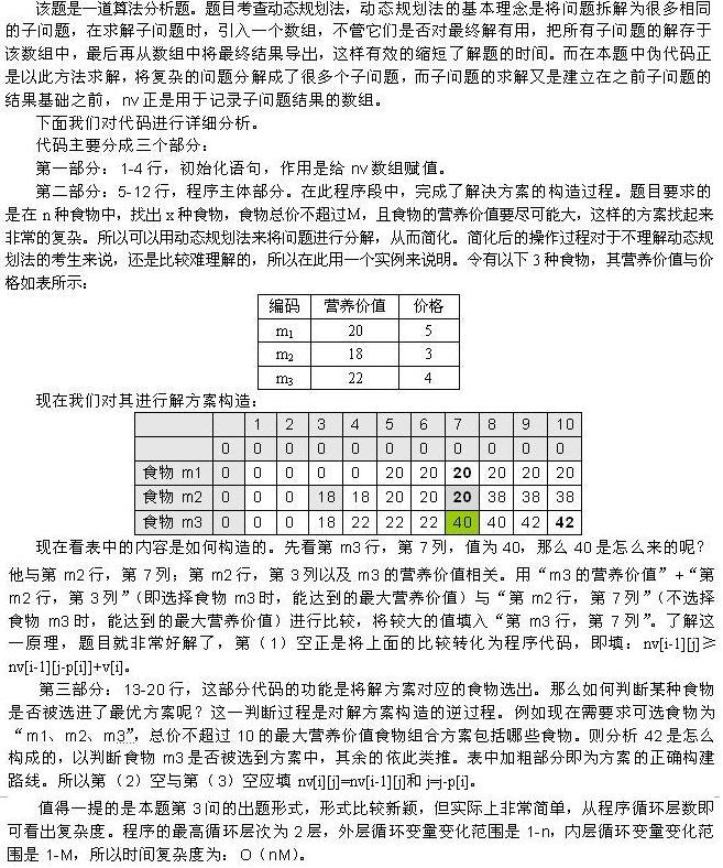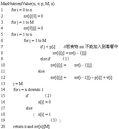 希赛公司供应各种标准的营养套餐。假设菜单上共有n项食物m1,m2,…,mn,每项食物mi的营养价值为vi,价格为pi,其中i=1,2,…,n,套餐中每项食物至多出现一次。客人常需要一个算法来求解总价格不超过M的营养价值最大的套餐。