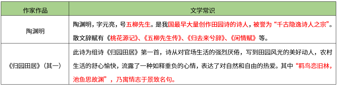【考点】本题考查作品篇目-诗词曲赋单元-《归园田居》(其一)【希赛点拨】