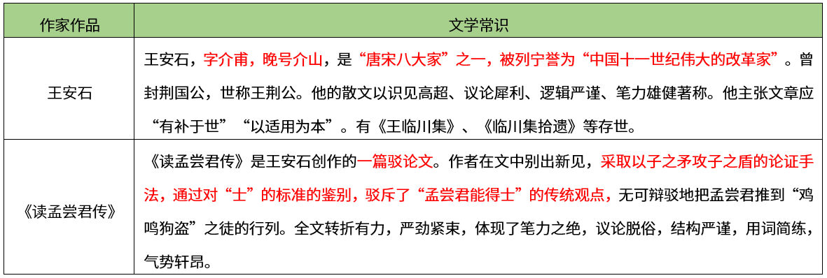 世皆称盂尝君能得士,士以故归之,而卒赖其力以脱于虎豹之秦。嗟乎!孟尝君特鸡鸣狗盗之雄耳,岂足以言得士?不然,擅齐之强,得一士焉,宜可以南面而制秦,尚何取鸡鸣狗盗之力哉?夫鸡鸣狗盗之出其门,此士之所以不至也。(王安石《读孟尝君传》)