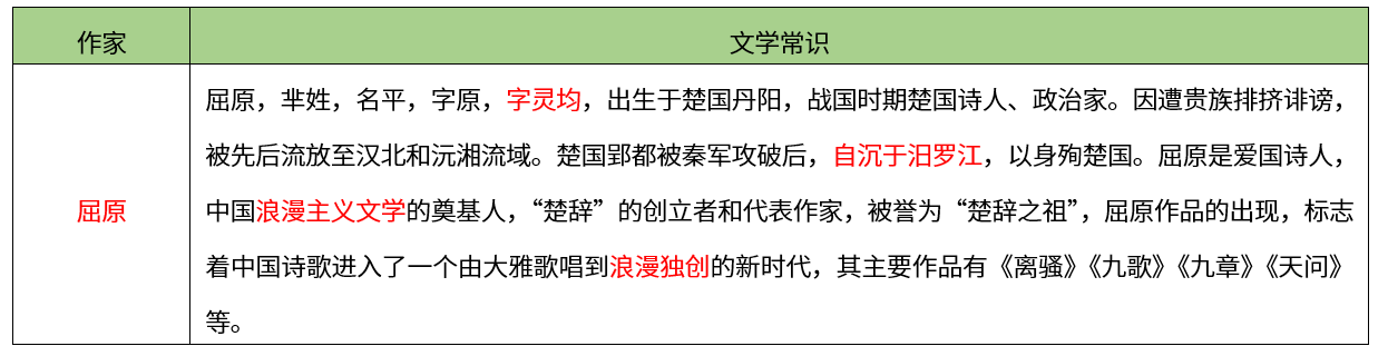 【解析】屈原是我国古代第一位伟大的爱国诗人,也是我国已知最早的著名诗人,我国浪漫主义文学的奠基人,“楚辞”的创立者和代表作家,开辟了“香草美人”的传统。故本题选B。