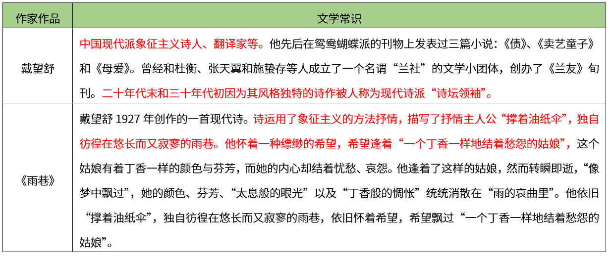【考点】本题考查指定篇目-诗词曲赋单元-《雨巷》