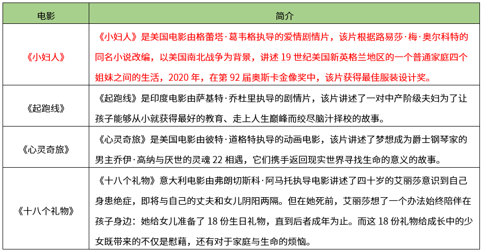 【考点】本题考查艺术种类-综合艺术-综合艺术的主要种类-电影艺术【解析】《起跑线》是印度电影;《心灵奇旅》是动画电影,与题干图片不符。《十八个礼物》意大利电影讲述了四十岁的艾丽莎身患绝症给女儿准备了18份生日礼物。主人公为母女二人,与图片不符。因此BCD当排除,《小妇人》是根据路易莎•梅•奥尔科特的同名小说改编,以美国南北战争为背景,讲述19世纪美国新英格兰地区的一个普通家庭四个姐妹之间的生活。故本题选A。【希赛点拨】