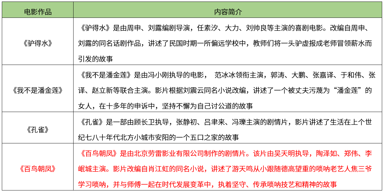 【考点】本题考查艺术种类-综合艺术-综合艺术的主要种类-电影艺术【解析】A项是任素汐饰演的张一曼在《驴得水》中的剧照;B项是范冰冰饰演的李雪莲在《我不是潘金莲》中的剧照;C项是张静初饰演的高卫红在《孔雀》中的剧照;D项是陶泽如饰演的焦三爷在《百鸟朝凤》中的剧照。故本题选B。【希赛点拨】