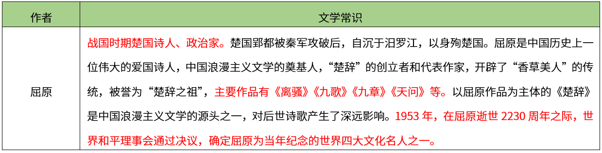 作品有《山鬼》《天问》《九歌》《九章》,1953年被列为“世界十大文化名人之一”的作者 。
