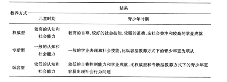 ①权威型教养方式:权威型父母的孩子发展得相当好。他们心情愉快,具有社会责任感,自立,有成就定向并且能够与成人和同伴合作良好。在儿童时期具有较高的认知和社会能力。青少年时期具有较高的自尊,非常好的社会技能,较强的道德、亲社会关注和较高的学业成就。(这种教养方式的父母对孩子是关爱和接纳的。他们对孩子表达了关爱,这种关爱可以促使孩子遵从父母的指导。父母的要求是公平合理的,而不是专断独裁,这样就会使孩子自愿地服从而不是抱怨或挑衅。父母合理地实行控制,考虑孩子观点的同时谨慎解释自己的观点,使得孩子可以实施的表达自己的观点,很好地和父母沟通。孩子可以根据父母适当的要求有一些自由或自主权来决定如何好地达到父母的期望。父母积极的反馈培养了儿童的自立能力、成就动机和较高的自尊。这种支持让青少年放心大胆地探索各种角色和意识形态,发展了个人的同一性。)