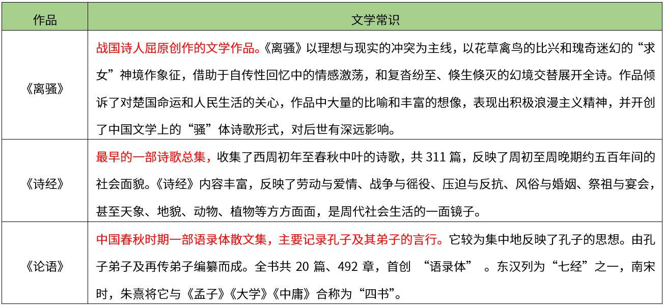 【解析】《楚辞》是我国第一部浪漫主义诗歌总集,以先秦楚国诗人屈原作品为主体的诗歌总集。《楚辞》多用比、兴手法于政治讽谏上,同时也较偏重于宗教政治、个人抒怀,讲述了知识分子的独善情怀、高洁品格或是展示了楚地的山川人物、历史风情,具有浓厚的地域文化色彩。故本题选A。