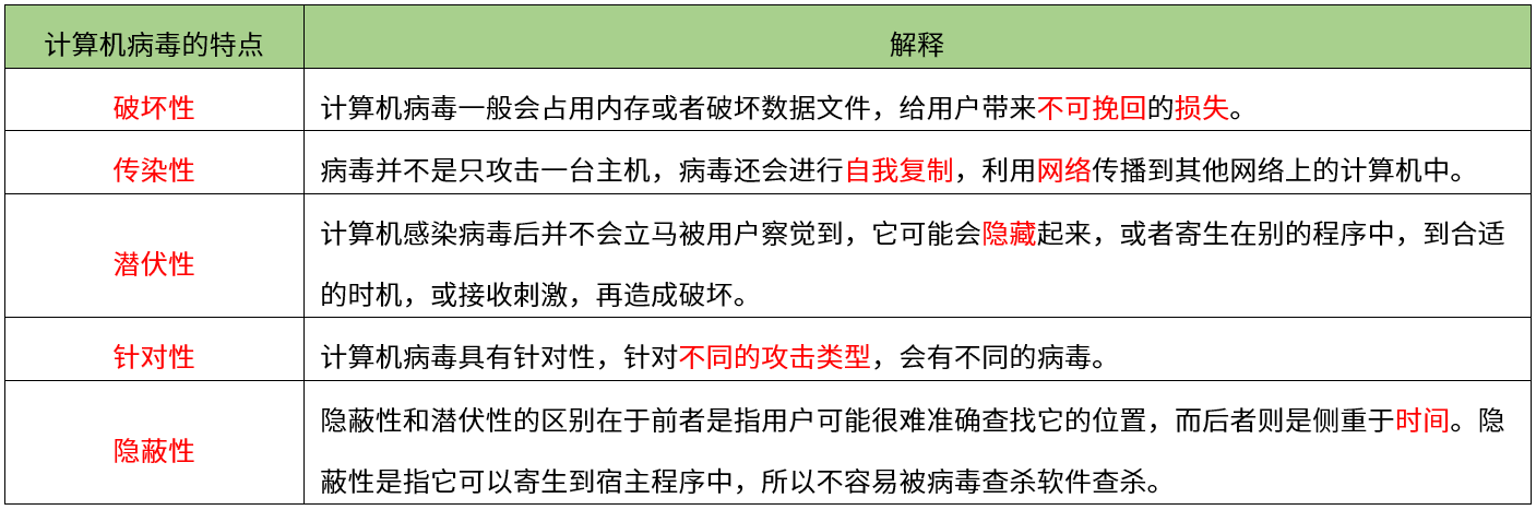 【考点】本题考查信息安全-计算机病毒-计算机病毒的特征【解析】计算机病毒,是指编制或者在计算机程序中插入的破坏计算机功能或毁坏数据,影响计算机使用,并能自我复制的一组计算机指令或者程序代码。计算机病毒具有破坏性、传染性、潜伏性、寄生性、隐蔽性、可执行性、针对性、免疫性、抗病毒软件性等,不具有免疫性。故本题选ABCD。【希赛点拨】计算机病毒的特征
