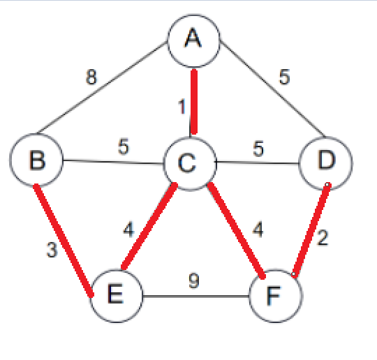 采用Kruskal算法求解下图的最小生成树,采用的算法设计策略是( )。该小生成树的权值是( )。