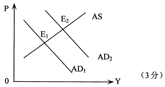 答:根据流动偏好理论,当货币供给增加,货币需求不变时,会导致均衡利率下降。 (1 分)利率下降,导致需求增加,总需求曲线右移,均衡点由E1点到E2点,短期内产量增加,物价上升。 (2 分)