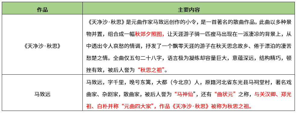 【考点】本题考查作家作品常识-辽西夏金元时期-《天净沙•秋思》
