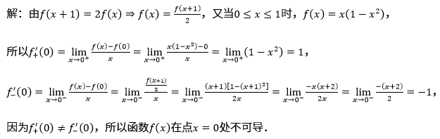 设函数f(x)在(-∞,+∞)内有定义,且对于任意的x,都有f(x+1)=2f(x).当0≤x≤1时,f(x)=x(1-x2).证明函数f(x)在点x=0处不可导.