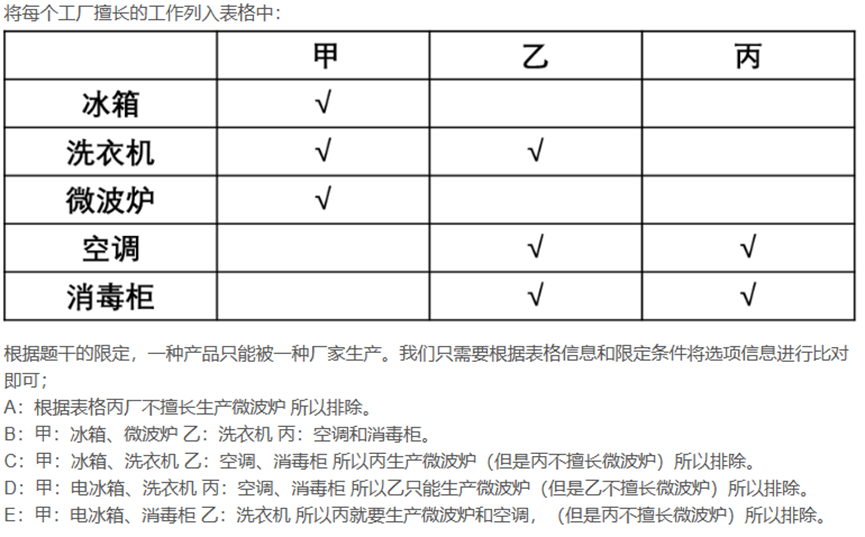 某家电公司有甲、乙、丙三个工厂:甲厂擅长生产电冰箱、洗衣机和微波炉;乙厂擅长生产洗衣机、空调和消毒柜;丙厂擅长生产空调和消毒柜。该家电公司调查后发现,如果两个工厂同时生产同样的产品,一方面达不到规模经济,另一方面会产生恶性竞争。为了更好地发挥各厂的相对优势,公司召集了三个工厂的负责人对各自生产的产品进行协调,并做出了满意的决策。以下哪项最可能是这几个工厂的产品选择方案?