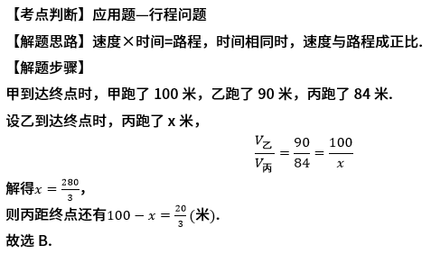 甲、乙、丙三人进行百米赛跑(假设他们的速度不变),甲到达终点时,乙距终点还差10米,丙距终点还差16米.那么乙到达终点时,丙距终点还有( ).